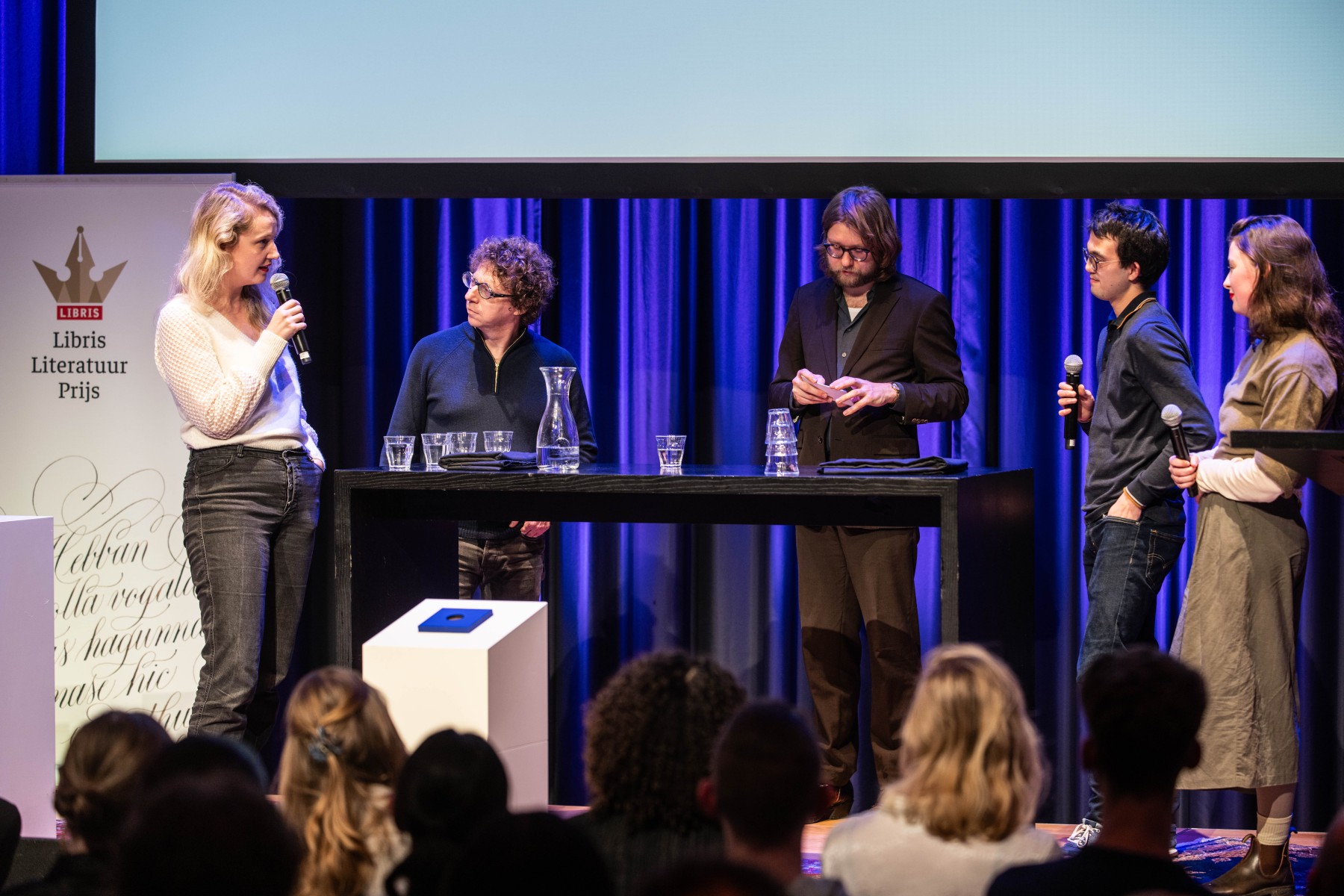 Voormalig Libris-winnaars Mariken Heitman, Abdelkader Benali en Arnon Grunberg en redacteur Katrijn van Hauwermeiren werden geïnterviewd door UvA-studenten van de Master redacteur/editor.